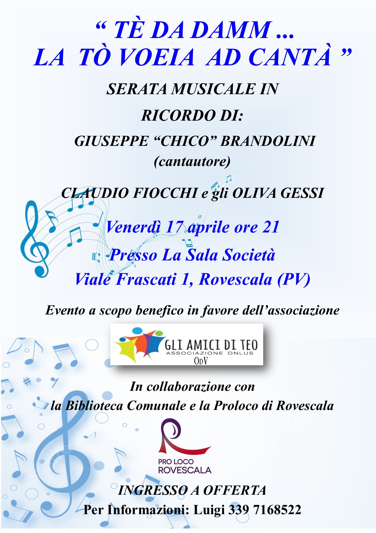 Presso la Sala Società, Venerdì 17 Aprile a partire dalle ore 21:00, si terrà la Serata musicale in ricordo di Giuseppe "Chico" Brandolini (cantautore) con Claudio Fiocchi e gli Oliva Gessi. Si tratta di un evento a scopo benefico in favore dell'associazione "Gli Amici di Teo" in collaborazione con la Pro Loco e la Biblioteca di Rovescala.